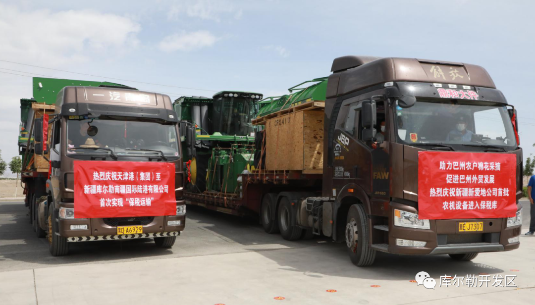 2020年6月11日,6臺(tái)CP690自走式大型采棉機(jī)“保稅運(yùn)輸”順利抵達(dá)南疆國(guó)際陸港(庫(kù)爾勒)有限公司公用型保稅倉(cāng)庫(kù),實(shí)現(xiàn)了南疆國(guó)際陸港(庫(kù)爾勒)有限公司與天津港海陸兩港聯(lián)動(dòng)。