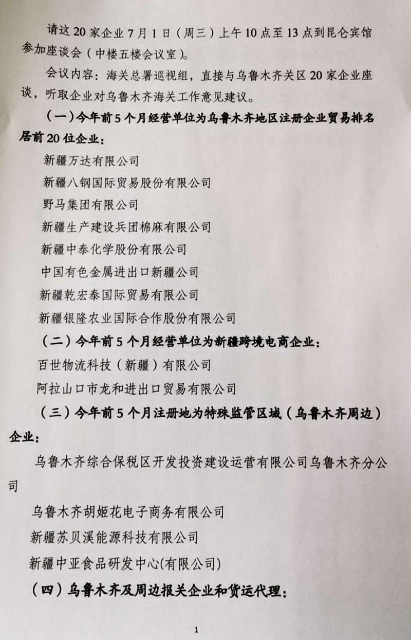 2020年7月1日上午10點(diǎn)-13點(diǎn),假新疆昆侖賓館中樓五樓會(huì)議室,海關(guān)總署黨委第九巡視組召開(kāi)了巡視烏魯木齊海關(guān)后的第一次關(guān)企座談會(huì)。今年前五個(gè)月經(jīng)營(yíng)單位為烏魯木齊地區(qū)注冊(cè)且企業(yè)貿(mào)易排名居前20位之內(nèi)的企業(yè)、今年前五個(gè)月經(jīng)營(yíng)單位為新疆的跨境電商企業(yè)、今年前五個(gè)月注冊(cè)地為特殊監(jiān)管區(qū)域(烏魯木齊周邊)的企業(yè)、烏魯木齊周邊保管企業(yè)和貨運(yùn)代理企業(yè),共二十家單位均派出代表參會(huì)。會(huì)上,各位代表就今年疫情影響及應(yīng)對(duì)措施、面臨世界經(jīng)貿(mào)形勢(shì)持續(xù)走低壓力下的新疆企業(yè)如何走出困境、為促進(jìn)企業(yè)發(fā)展、關(guān)企寫(xiě)作與互動(dòng)等方面積極踴躍發(fā)言,提出了很多好的建議與意見(jiàn)?偸鹧惨暯M成員將上述給位代表提出的中肯意見(jiàn)和建議一一記錄在案,表示將協(xié)調(diào)烏魯木齊海關(guān)進(jìn)行充分溝通積極解決。